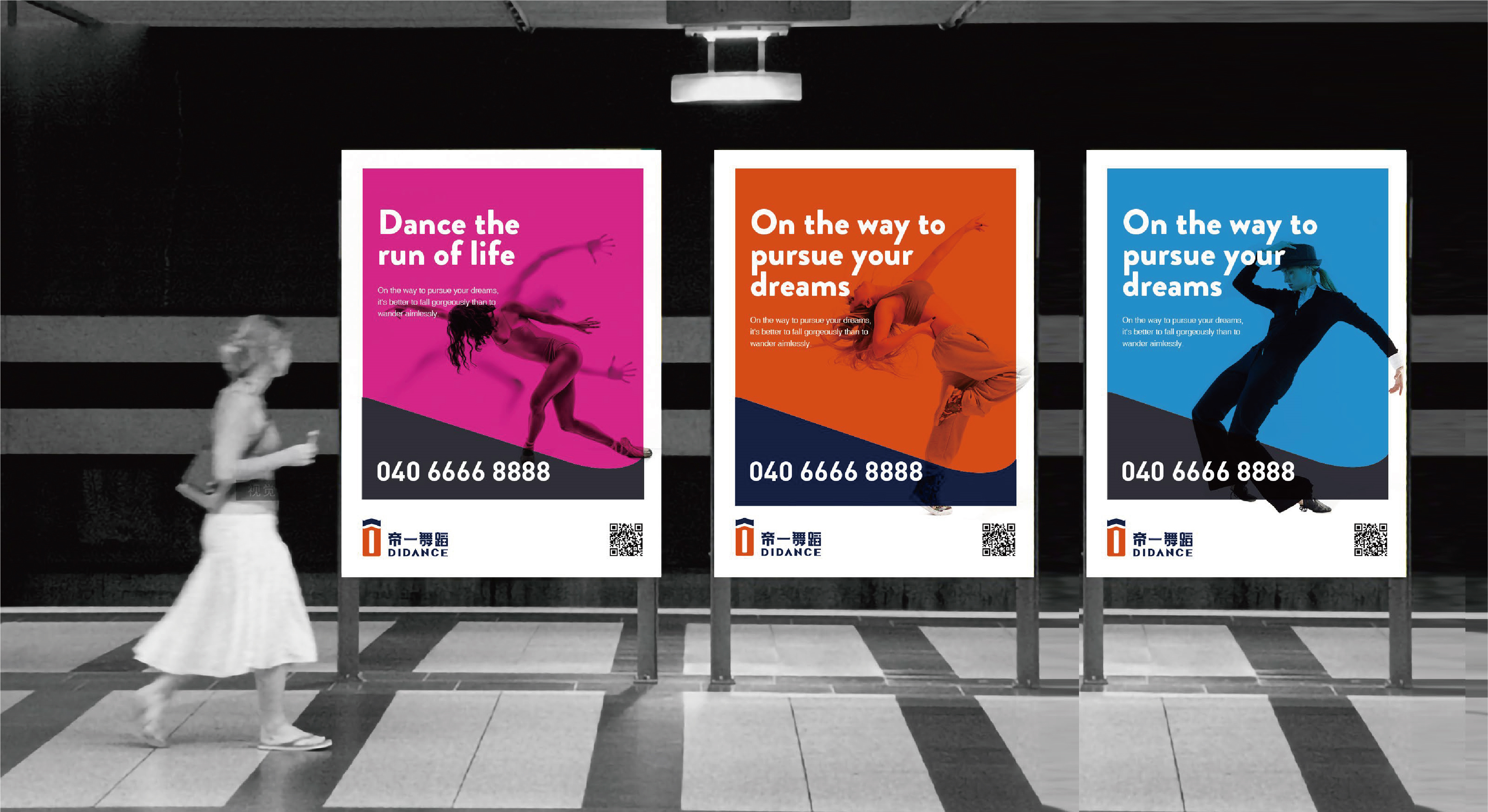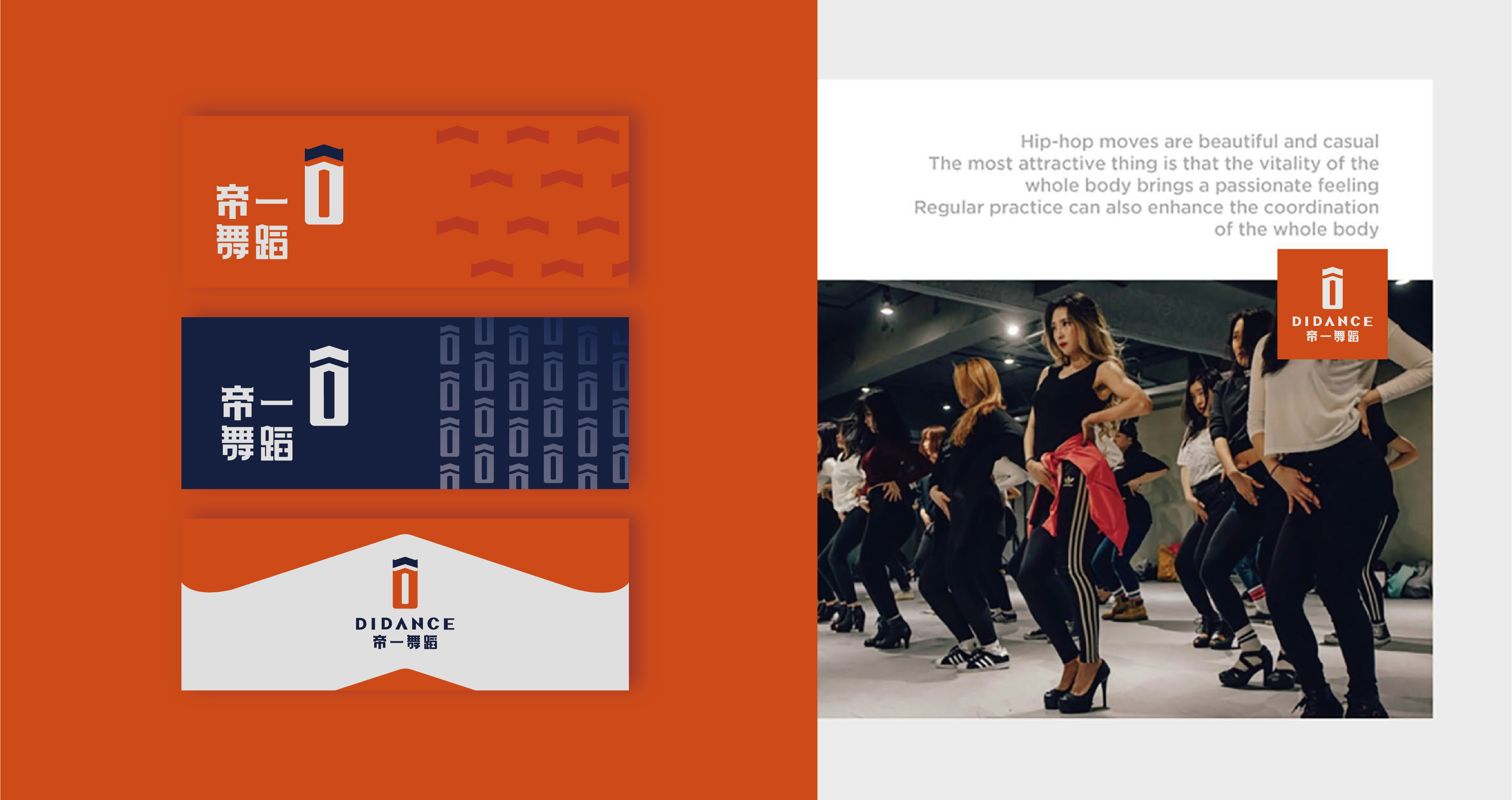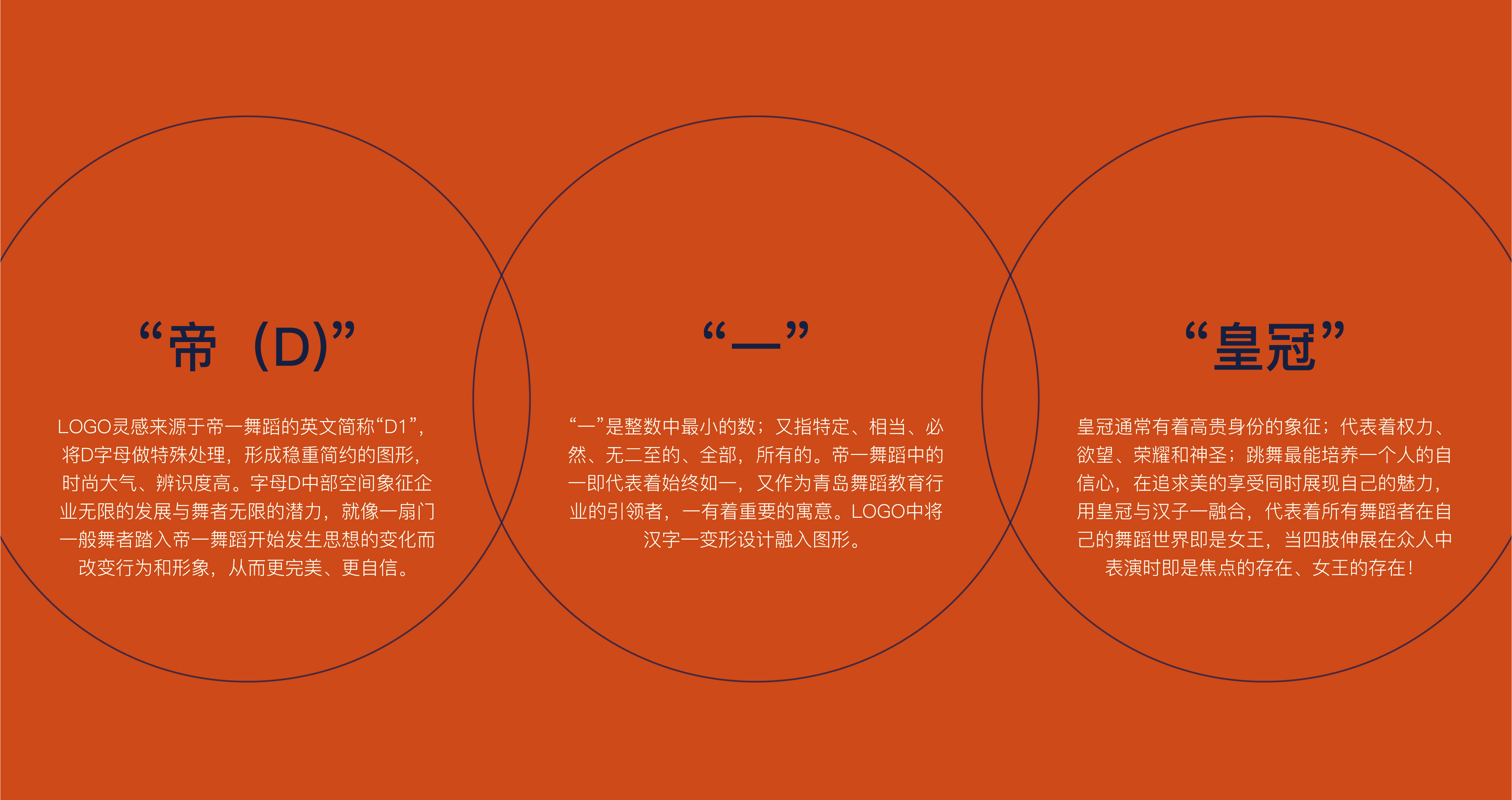 LOGO靈感來源于帝一舞蹈的英文簡稱“D1”,將D字母做特殊處理,形成穩(wěn)重簡約的圖形,時尚大氣、辨識度高。字母D中部空間象征企業(yè)無限的發(fā)展與舞者無限的潛力,就像一扇門一般舞者踏入帝一舞蹈開始發(fā)生思想的變化而改變行為和形象,從而更完美、更自信。