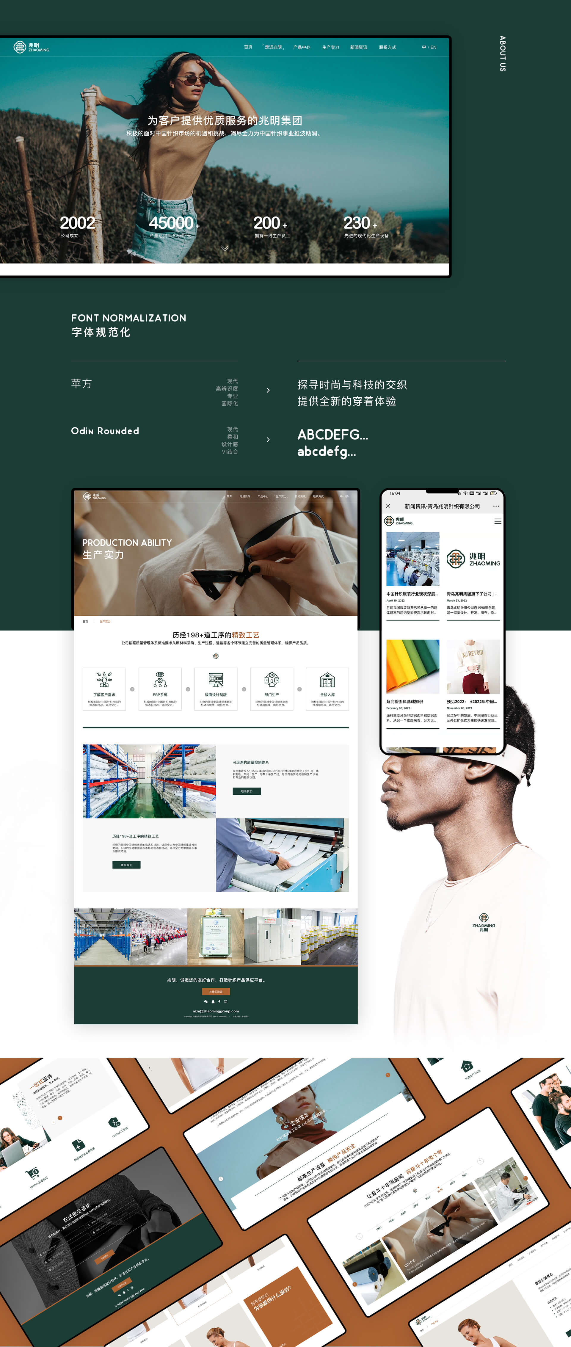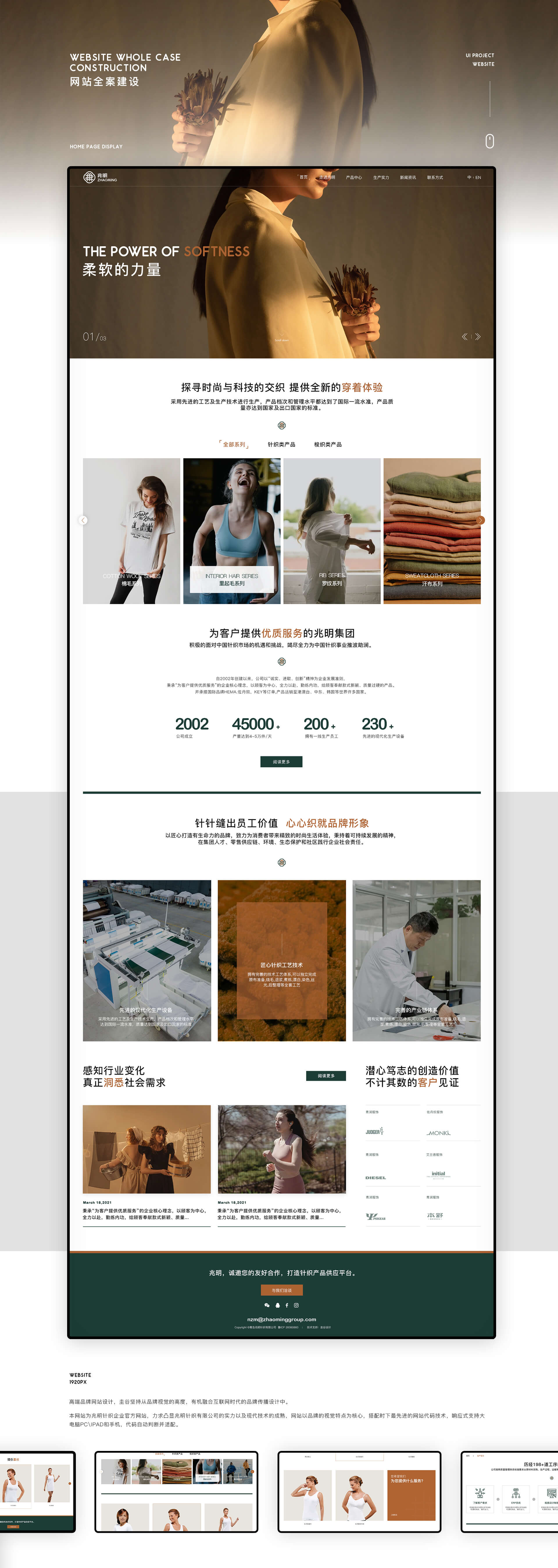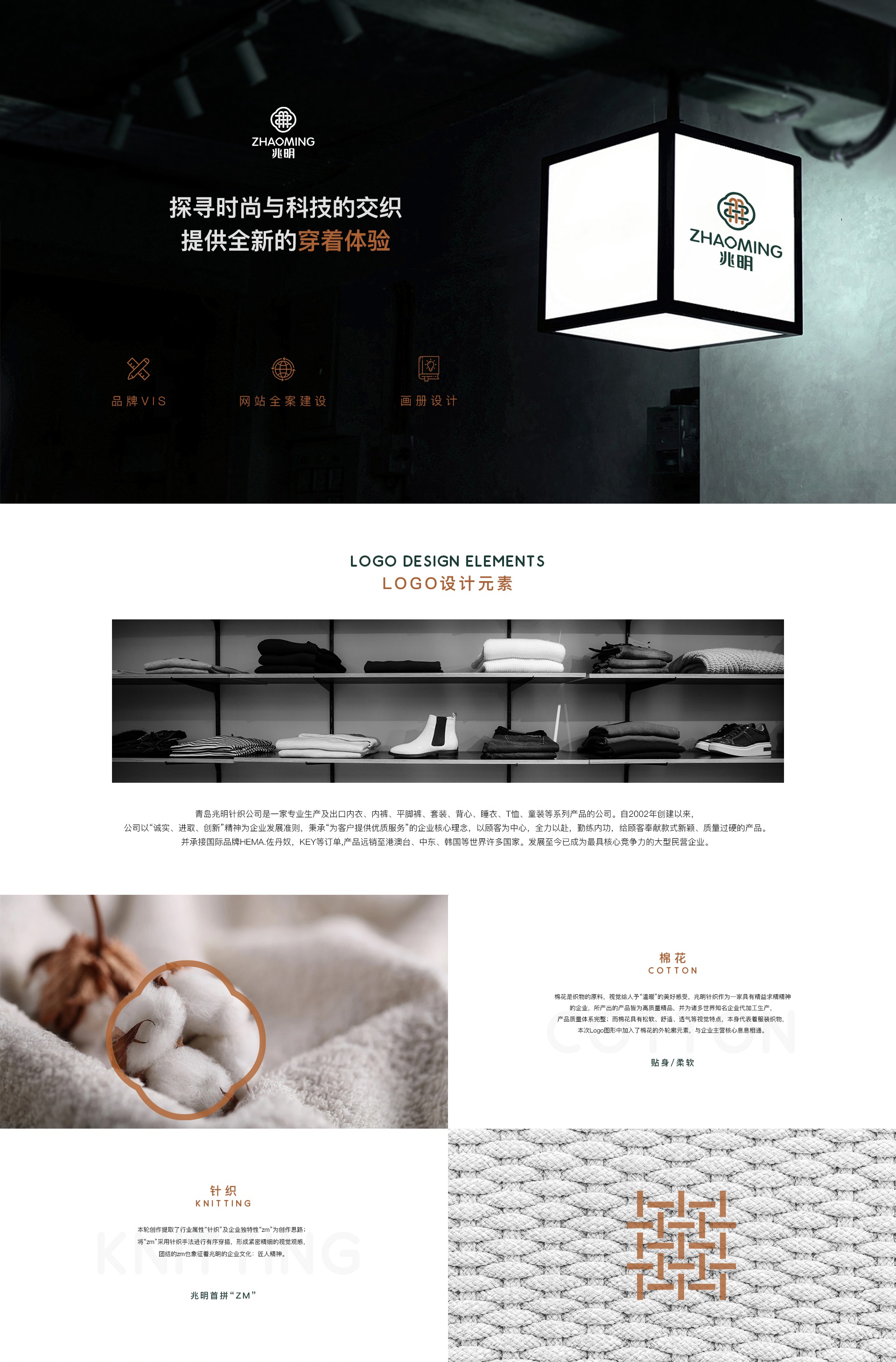 成拉于1990年的兆明針織,是一家具有丘心精神的企業(yè),目前擁有25萬平方米智能化服裝產(chǎn)業(yè)鏈基地,產(chǎn)量達(dá)10萬件天;采用先進(jìn)的工藝及生產(chǎn)技術(shù)進(jìn)行生產(chǎn),具備2300合現(xiàn)代化生產(chǎn)設(shè)備;產(chǎn)品檔次和管理水平均達(dá)到國際一流水準(zhǔn);并為諸多世界知名企業(yè)代加工生產(chǎn),兆明秉持著可持續(xù)發(fā)展的精神;致力為消費(fèi)者帶來精致的時尚生活體驗。logo升級與服裝品牌公司畫冊設(shè)計服務(wù)由圭谷設(shè)計。